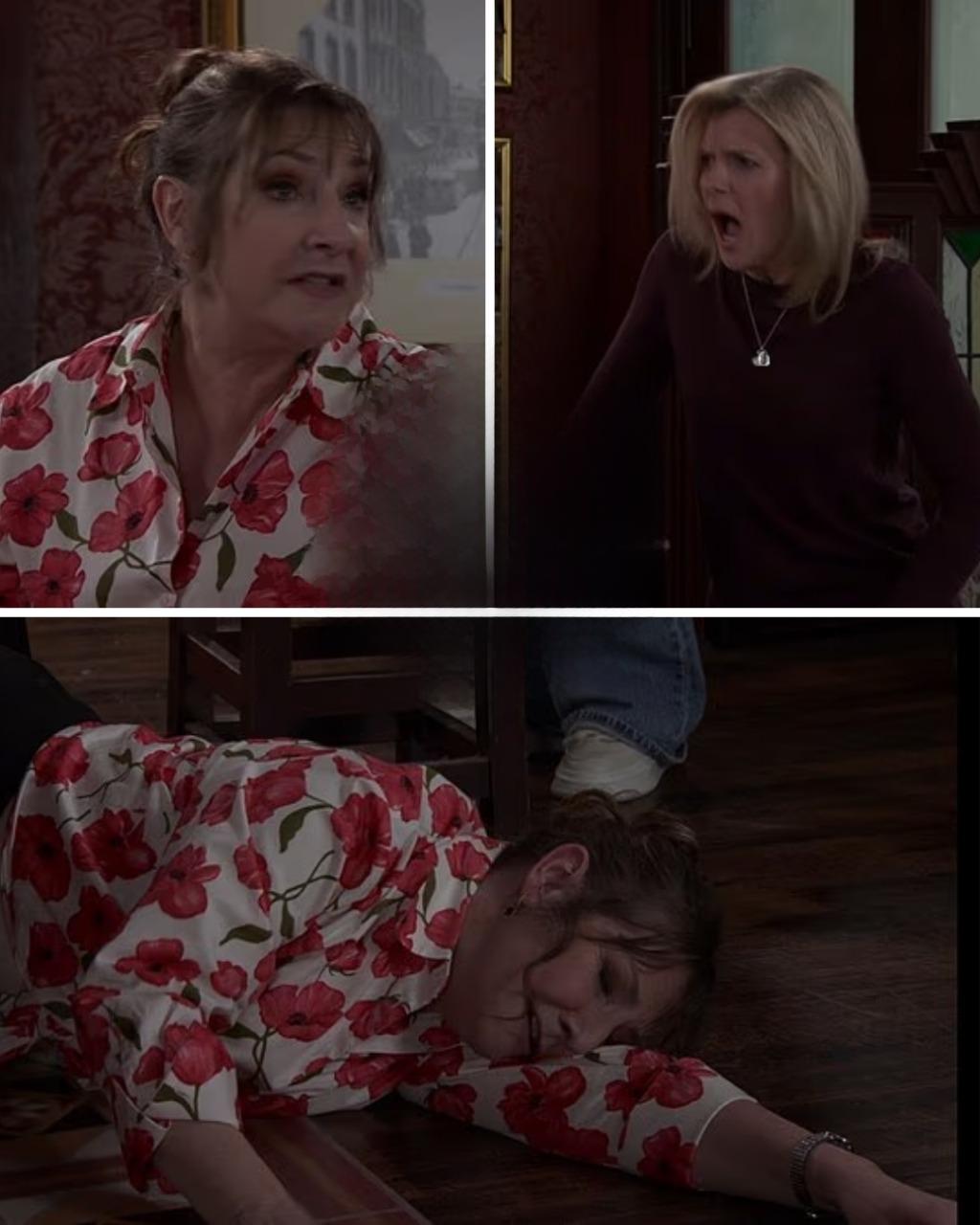 After Maggie rejected Leanne’s offer to buy out her stake in the Rovers Return, she dramatically staged a fall – claiming Leanne shoved her